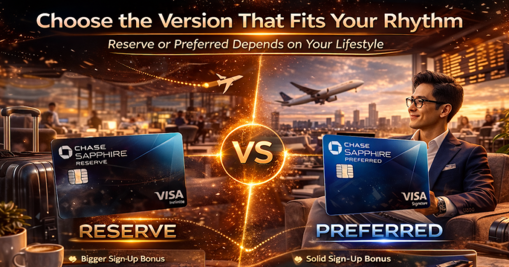 Sapphire Reserve® makes more sense if you travel frequently — the higher annual fee is offset by lounge access, travel credits, and elevated earning rates for people who are realistically using those features. If you’re an investor or remote worker who flies regularly, the math can work out in your favor.